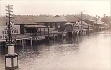 At the beginning of the 20th century, river navigation was still the mainstay of transportation in Lismore, the principal operator being the North Coast Steam Navigation Company. The dairy industry was performing strongly, employing hundreds of small family-owned operations, the Lismore region becoming the centre for dairy production from the surrounding farms and the richest dairy district in Australia.[9] The railway station had opened in 1894 as the starting point of the Murwillumbah railway line which, starting at that time in Lismore, ran to the coast at Byron Bay (from which steamers could be caught to Sydney) and then on to Murwillumbah, and subsequently in 1903 inland to Casino, but was not connected to any national network. However, as the century progressed, development of a better road network and the advance of motor transportation made inroads into the long-term success of both the river and rail traffic which eventually declined: river traffic was also affected by requisitioning of ships during the second world war and the largest shipping line operating on the two arms of the Richmond River, the North Coast Steam Navigation Company, went into liquidation in 1954; the railway line lasted until 2004 when it was closed on purely economic grounds after advising that it was "unprofitable" to continue providing services to Murwillumbah, putting an end to 110 years of rail transport in the region.[10] Meanwhile, economic development in Lismore continued, including construction of a new School of Arts (1907, destroyed by fire in 1932), building of churches for four denominations, opening of a new Norco (dairy farmers' cooperative) factory in 1931, and other utilities.
