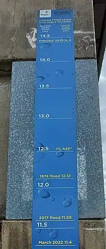 In February 2022, Lismore and other parts of Northern New South Wales and South East Queensland were flooded to an unprecedented degree, resulting in serious devastation to many buildings in the CBD in addition to adjacent low lying residential areas which will take "years to rebuild".[37] The Wilsons River in Lismore reached 14.37 metres at its peak, the largest flood since modern records began.[38] One year on from the disaster, the process of reconstruction was still ongoing.[39]