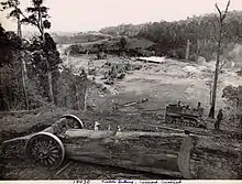From the 1840s onwards, timber cutters moved up the Richmond River from its Ballina entrance felling timber from the extensive, previously untouched subtropical rainforest covering the region known as the "Big Scrub"; their primary interest was the Australian red cedar, Toona ciliata, known locally as "red gold", which was highly prized for its appearance, ease of working, and pest resistance. At that time there was no substantial network of roads so rivers were the primary means of access and bulk transportation. Despite its low-lying position and propensity for flooding (which was to cause problems in subsequent times), Lismore developed as an inland port owing to its location at the highest navigable point for large cargo-carrying vessels on the north arm of the Richmond, later renamed the Wilsons, River. For the second half of the 19th century the primary industries of the Lismore region continued to be cattle grazing and timber, supporting a growing economy and population and the development of secondary industries which included ship building, transportation, saw milling, tallow manufacturing and more.[9] As the Big Scrub was cleared, it was steadily replaced with new pasture which formed the basis of a flourishing dairy industry, and many processing plants ("butter factories") and dairy cooperatives were established throughout the region. Infrastructure development in Lismore continued, including the presence of three schools by 1879, a new Government Wharf in 1880, two new bridges over the river in 1884 and 1885, the railway station (1894) and a new post office building (1898); by the end of that century Lismore had a population of over 4,500, although had suffered from some ravages including numerous floods plus a period of drought in the last half of the 1890s.[9]