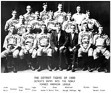 The Tigers were established as a charter member of the now major league American League in 1901.[17] They played their first game as a major league team at home against the Milwaukee Brewers on April 25, 1901, with an estimated 10,000 fans at Bennett Park.[14][18] After entering the ninth inning behind 13–4, the team staged a dramatic comeback to win 14–13.[18] The team finished third in the eight-team league.[19]