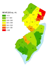 The following are approximate tallies of current listings in New Jersey on the National Register of Historic Places. These counts are based on entries in the National Register Information Database as of April 24, 2008[2] and new weekly listings posted since then on the National Register of Historic Places web site.[3] There are frequent additions to the listings and occasional delistings and the counts here are approximate and not official. New entries are added to the official Register on a weekly basis.[4] Also, the counts in this table exclude boundary increase and decrease listings which modify the area covered by an existing property or district and which carry a separate National Register reference number. The numbers of NRHP listings in each county are documented by tables in each of the individual county list-articles.