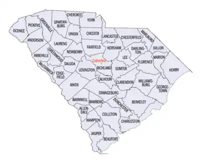 - ↑ The following sites are listed in multiple counties: Ashley River Historic District (Charleston and Dorchester), Ashley River Road (Charleston and Dorchester), Gervais Street Bridge (Lexington and Richland), Kings Mountain National Military Park (Cherokee and York), Pendleton Historic District (Anderson, Oconee and Pickens).
