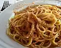 Pasta chi Vrocculi Arriminati | ![]() | a pasta dish from Palermo which generally consists of a long pasta like spaghetti or bucatini, cauliflower, onion, raisins, anchovies, pine nuts, saffron, red chili, and breadcrumbs |