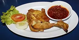 Meat dish | Fried chicken dish consisting of fried chicken that is smashed with the pestle against mortar to make it softer, served with sambal, slices of cucumbers, fried tofu and tempeh. |
