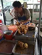 Satay bee hoon | Noodle dish | Satay bee hoon sauce is a chilli-based peanut sauce very similar to the one served with satay. The satay sauce is spread on top of rice vermicelli.[4] |