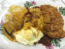 Rice dish | Hainanese Curry Rice is a dish consisting of plenty of steamed white rice smothered in a mess of curries and braised pork gravy.[5] |