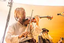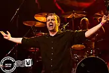 Blackgaze is a genre fusion of black metal and shoegaze that originated in the early 2000s.[47][48] The genre often incorporates heavier elements common of black metal, including blast beat drumming and high-pitched screamed vocals with melodic elements, and heavily distorted "Wall of Sound" guitar styles typically associated with shoegazing. The French shoegazing band Alcest is often credited with having influenced and formed the genre, while American bands such as Deafheaven have become synonymous as to defining the genre's characteristics.[49][50]