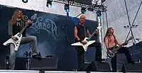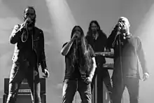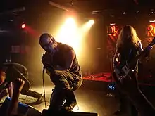 During the 1980s, several thrash metal bands formed a prototype for black metal. This so-called "first wave" included bands such as Venom, Bathory, Mercyful Fate, Hellhammer and Celtic Frost.[32] A "second wave" arose in the early 1990s, spearheaded by Norwegian bands such as Mayhem, Burzum, Darkthrone, Immortal, and Emperor. The music of the early Norwegian black metal scene became a distinct genre. Initially considered a synonym for "Satanic metal", black metal has often been met with hostility from mainstream culture, mainly due to the misanthropic and anti-Christian standpoint of many artists. Moreover, several of the genre's pioneers have been linked with church burnings and murder. Some have also been linked to neo-Nazism; however, most black metal fans and most prominent black metal musicians reject Nazi ideology and oppose its influence on the black metal subculture.[33][34][35]