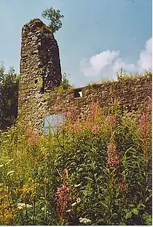 Lochwood Tower, a Motte-and-bailey castle overlain by a later stone castle, lies on the east of a promontory about 600 metres (2,000 ft) long and 400 metres (1,300 ft) wide, which thrusts northwards into an area of largely-unreclaimed moss.[2] The tower, which was once a strong castle, incorporates some 15th-century work. Not much remains above the level of the vaulted basement. There was a courtyard contained by a wall, which contained the kitchen and other buildings.[1] The hall would have been on the first floor of the main block, with private chambers above. The entrance, which led to a wide turnpike stair, was in the wing.[1] On the north was a hillock 'apparently in part artificial' named 'The Mount', a circular double-terraced motte with ramparts, apparently a Norman predecessor of the stone tower. To the south of the tower, in the centre of a level meadow which was probably the garden, was an artificially-looking, ditched earthen mound, some 9 feet (2.7 m) high and 36 feet (11 m) to 40 feet (12 m) across the base.[2]