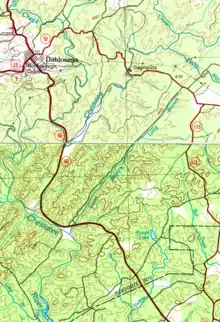 Long Branch rises in southeastern Lumpkin County, just south of the intersection of State Route 52 and State Route 115, east of Dahlonega.[2] The creek heads southwest in an almost completely straight line parallel to and immediately adjacent to State Route 115, which is named Long Branch Road from its crossing with the Chestatee River to its terminus at U.S. Route 19. Long Branch picks up two unnamed branches from the east on its way to the Chestatee, and joins the river at the intersection of U.S. Route 19/State Route 60/State Route 115 south of Dahlonega, where US 19/SR 60 curve to the west to head to Dahlonega, and SR 155/Long Branch Road heads northeast.[3]