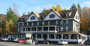 Long Lake is part of the 1.1 million acres (4,500 km2) acquired from the Mohawk nation as part of the 1771 Totten and Crossfield Purchase.[7] Long Lake is a glacial widening of the Raquette River and is part of the water route that connects the Fulton Chain Lakes with the Saint Lawrence River drainage. This route was frequently traveled by guideboat in the mid-late 19th century. At that time, "a typical trip might start at the Saranacs from which a party could make its way to the Raquette River via Indian Carry and Stoney Creek."[8] The trip continued "via the lakes accessible from it— Long, Raquette, Forked, Blue and Tupper."[8] Settled by the 1830s, Long Lake was isolated, except by water, until William Seward Webb's Mohawk and Malone Railway was built through what was then known as Long Lake West in 1892. Long Lake and Long Lake West were connected by a stage route. The Mohawk & Malone Railway was taken over by the New York Central and Hudson River Railroad in 1894, and was merged into the New York Central Railroad in 1913. Passenger rail service on the NYC ended on April 24, 1965. The town of Long Lake West was later renamed Sabattis, after Peter Sabattis and his son Mitchell Sabattis, the Abenaki Indian guides who came down from Canada and first settled in this area, followed by a long line of their offspring and family.
