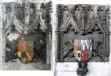 Remnants of chest-tomb of Sir Robert Poyntz (d. 1520) in the Gaunt's Chapel, Bristol, showing heraldry of Poyntz and Woodville. The 5th quarter of the shield at right shows Woodville with a baton sinister for bastardy