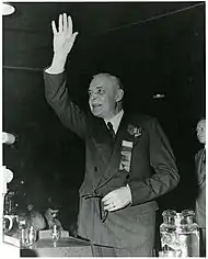 It was not until he was nearly 60 that St. Laurent finally agreed to enter politics when Liberal Prime Minister William Lyon Mackenzie King appealed to his sense of duty in late 1941.[10] King's Quebec lieutenant, Ernest Lapointe, had died in November 1941. King believed that his Quebec lieutenant had to be strong enough and respected enough to help deal with the volatile conscription issue. King had been a junior politician when he witnessed the Conscription Crisis of 1917 during World War I and wanted to prevent the same divisions from threatening his government. Many recommended St. Laurent for the post. On these recommendations, King recruited St. Laurent to cabinet as Minister of Justice, Lapointe's former post, on 9 December. St. Laurent agreed to go to Ottawa out of a sense of duty, but only on the understanding that his foray into politics was temporary and that he would return to Quebec at the conclusion of the war. In February 1942, he won a by-election for Quebec East, Lapointe's former riding, which had been previously held by Laurier. St. Laurent supported King's decision to introduce conscription in 1944 (see Conscription Crisis of 1944). His support prevented more than a handful of Quebec Liberal Members of Parliament (MPs) from leaving the party and was therefore crucial to keeping the government and the party united.[11] St. Laurent was King's right-hand man.[12]
