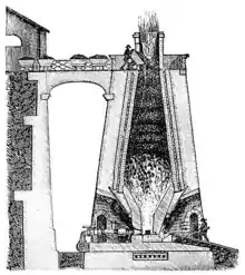Blast furnace for production of pig iron. Later the Low Moor furnaces used self-tipping wagons to deliver ore, coke and limestone.