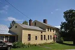The Andrews House stands close to the east side of South Bridgton Road (Maine State Route 107) in a rural area of southern Bridgton. The house is a rambling connected series of wood-frame structures, with the main house block at the southern end, and ells extending along the road to the north and behind the house to the east. The main block is a 2+1⁄2-story structure, five bays wide, with a side gable roof, central chimney, clapboard siding, and a stone foundation. Decorative elements are minimal, with the central entrance framed by pilasters and a fanlight, with a dentillated cornice above. A shed-roof porch extends across the southern facade, supported by fluted Doric columns. A 1+1⁄2-story four-bay addition, its front flush with that of the main block, extends north, with another section extending further north to join the house to a carriage barn. On the east side a series of two ells join the house to a livestock barn.[2]