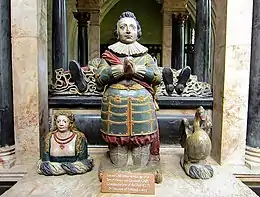 A statue of Falkland sculpted by John Bell in 1845 stands in St Stephen's Hall in the Houses of Parliament.[6] In 1909 a suffragette called Margery Humes chained herself to the statue while protesting for women's right to vote. The authorities were unable to remove her without chipping off much of the spur on the statue's right boot. As it was never repaired, this lasting damage is considered a symbol of the suffragettes' struggle.[7]