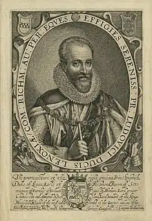 Ludovic Stewart, 2nd Duke of Lennox and 1st Duke of Richmond (29 September 1574 – 16 February 1624), lord of the Manor of Cobham, Kent, was a Scottish nobleman who through their paternal lines was a second cousin of King James VI of Scotland and I of England. He was involved in the Plantation of Ulster in Ireland and the colonization of Maine in New England. Richmond's Island and Cape Richmond as well as Richmond, Maine (formerly Fort Richmond), are named after him. His magnificent monument with effigies survives in Westminster Abbey.[4]