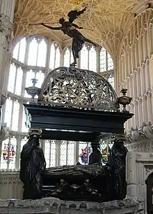 Stewart was buried in Westminster Abbey, in the Richmond Vault[61] in the Henry VII Chapel (that king formerly having been Earl of Richmond) above which is his domed black marble monument by Hubert Le Sueur with gilt-bronze recumbent effigies of himself and his wife. The Latin inscription may be translated as follows: