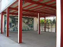 The Spanish Pavilion had a rationalist architecture and used modern, functional materials.[5] The temporary building was erected quickly on a small site in the Jardins du Trocadéro, with a very limited budget.[15] It tried to demonstrate that despite the civil war the Spanish Republic was committed to modernity and humanism.[5] The structure had an exact, cool geometry that emphasises horizontal shapes. It was largely colored in shades of gray, although the red lines of the painted metal structure gave a Spanish touch. It contained Pablo Picasso's painting Guernica. Picasso visited the pavilion while it was being built, and Sert visited Picasso in his workshop while he was making the painting.[13] The Spanish pavilion was rebuilt in Barcelona for the 1992 Summer Olympics.[1]