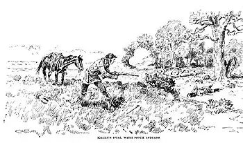Not long after his arrival at Fort Buford, Kelly volunteered to carry dispatches to Fort Stevenson, approximately fifty miles down the Missouri River. He left the fort on February 5, 1869.[12] The route between the forts was considered so dangerous, due to the presence of Sioux warriors, that mail carriers were generally accompanied by a cavalry escort, but Kelly set out alone.[13] He arrived safely at Fort Stevenson then set out on his return journey, spending the night at the camp of Bloody Knife, an Arickaree chieftain. The next morning, Kelly was ambushed by two Sioux warriors. The first wounded Kelly's horse with a rifle, while the second shot Kelly in the knee with an arrow. Kelly managed to shoot and kill the first attacker quickly, but the second took cover behind a tree. Kelly eventually shot and killed his second assailant, then returned to Bloody Knife's camp to tell the story.[14] Kelly spent a few days at Bloody Knife's camp recovering from his wound, then rode back to Fort Buford, becoming "something of a hero and a local celebrity" for defeating his two assailants.[15]