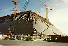 Perini Building Company served as general contractor.[14] The project employed more than 150 contractors and 3,500 construction workers,[15] several of whom died while building the resort.[16] Waltek, a Cincinnati-based company, provided the metal-and-glass exterior for the pyramid. Standing 30 stories high, it was one of the largest metal-and-glass projects ever.[5] The pyramid was topped off on July 9, 1993.[14]