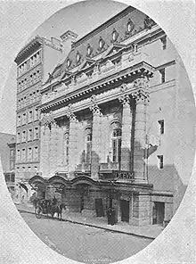 The old Lyceum ultimately closed on March 22, 1902.[62] Work on the new theater began on April 1, a week after the old Lyceum was closed.[63] The cornerstone was laid on October 16, 1902,[53][64][65] upon which thirteen of the old Lyceum's bricks were placed into the new theater.[63][65] By then, the basement and cellar were largely complete and the theater was to be completed early the following year.[64] The theater was supposed to open in September 1903[13] but encountered so many delays that the inaugural play, The Proud Prince, could only be scheduled at the Lyceum for two weeks.[66] Daniel Frohman, his brother Charles Frohman, and William Harris formed the New Lyceum Theatre Company and divided ownership of the Lyceum equally. Instead of distributing stock, the company issued six promissory notes of $118,328 each, which could not be collected for as long as each partner lived.[67]