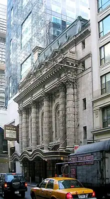 The primary elevation of the facade is on 45th Street and is made of limestone.[1][12][13] A promotional brochure from the theater's opening in 1903 said that the facade "recalls in its style and amplitude the best period of Roman art".[14] The street-level facade is made of rusticated blocks of limestone.[15] Three large archways lead into the lobby;[16][17] their doors are made of painted wood and contain arched panels of glass.[18] The street level entrances are shielded by a sinuous marquee canopy made of iron and glass.[19][20] When the theater opened, the entrance had a self-supporting canopy that could shield either five[17] or eight carriages unloading their passengers.[13][16] In 1986, the canopy was replaced with a replica that was cantilevered from the facade with metal rods. The modern canopy has moldings of pressed metal, medallions above each archway, and glass panels hanging underneath the canopy.[19] The design of the Lyceum's canopy was subsequently replicated by that of the Paramount Theatre.[21][lower-alpha 1]