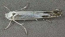 The wingspan is 7–9 mm. The forewings are shining white, sometimes partly or wholly suffused with fuscous ; a brown or darker fuscous blotch in disc posteriorly ; a bent transverse line beyond this, and three costal streaks connected with an apical spot brown or darker fuscous ; a round black apical dot ; a projecting blackish hook in apical cilia. Hindwings are dark grey. The larva is pale green.[1]
