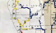 When the state highway system was first signed in 1919,[4] M-41 was designated between Holton and Hart.[2] After the creation of the United States Numbered Highway System on November 11, 1926,[5] and the designation of U.S. Highway 41 in the Upper Peninsula,[6] the Michigan State Highway Department renumbered the state highways that had numbers that duplicated the then-new US Highways. In the process, the M-41 designation was decommissioned. the southern half became part of a newly designated M-20. The northern half was made part of M-82.[3]