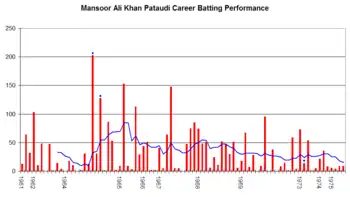 He played in 46 Test matches for India between 1961 and 1975, scoring 2,793 runs at a Test batting average of 34.91, including 6 Test centuries.[13] Mansoor was captain of the Indian cricket team in 40 of his 46 matches, only 9 of which resulted in victory for his team, with 19 defeats and 19 draws.[20] His victories included India's first ever Test match win overseas against New Zealand in 1968. India went on to win that series, making it India's first ever Test series win overseas.[21] He lost the captaincy of the Indian cricket team for the tour to the West Indies in 1970–1, and did not play Tests from 1970 to 1972. He returned to the India side captained by Ajit Wadekar in 1973, for the Third Test against England, and captained India against West Indies in 1974–5, but was finally dropped as a player in 1975.