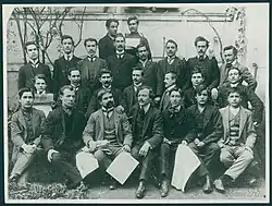Unable to reach the mass they desired, the Socialists decided to join the IMRO, but under certain conditions: autonomy within the Organization; freedom of socialist agitation; participation by right of one of their representatives in each district committee of IMRO.[4] These conditions were accepted only by the Bitola revolutionary district, and the socialist Nikola Karev became the Krushevo district voivode and took an active part in the Ilinden Uprising in 1903. After the failure of the uprising there was discord both in the IMRO and in the BWSDP itself. After the Young Turk Revolution in 1908, the Marxist Bulgarian Social Democratic Workers' Party (Narrow Socialists) sympathized with the Bulgarian People's Federative Party and created its social democratic groups and trade unions in Macedonia and Adrianople Thrace. At the end of July 1908, Vasil Glavinov left from Bulgaria for the Ottoman Empire and toured Edirne, Alexandroupolron, Serres, Kommotini, Xanthi, Drama and settled in Thessaloniki.[5] At the end of 1910, a conference was held in Thessaloniki to establish an Ottoman Socialist Party, but attempts failed without much success.