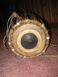 The Maddale (Kannada: ಮದ್ದಲೆ), also known as Mrudanga (ಮೃದಂಗ) in North Canara, is a percussion instrument from Karnataka, India. It serves as the primary rhythmic accompaniment in a Yakshagana ensemble, along with Chande. The maddale produces a perfectly hormonic tonic (shruti swara) when struck anywhere on its surface. This is in contrast to other instruments such as the Mrudangam, Pakawaj, or Tabla, which cannot produce the tonic (shruti) on all parts of their surfaces. Its drum head is similar to that of the tabla and its body is similar to that of the pakhavaj.