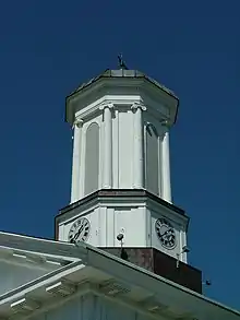 Above the central block and in line with the two wings rises a tall octagonal cupola, with four clock faces located respectively on each of the cardinal sides, just above its base. It is marked at each of its eight corners by an engaged Ionic column. Large sash windows punctuate the south façades and, originally also the east and west ends of the two smaller wings. Today the exterior constitutes the only part of the structure that retains the Greek Revival details. The portico sports a thin two-banded architrave and above that a prominent yet severe frieze of triglyphs separated by bare metopes; an additional bay is allotted for the central intercolumniation. Heavy modillions with guttae adorn the raking cornice and pediment that crown this part of the structure.