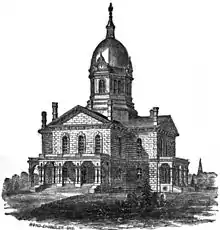 It was replaced by a stone courthouse designed by G.P. Randall and built beginning in 1868. It was a Greek cross-shaped structure composed of locally quarried limestone that was capped with an octagonal dome. There was a jail on the second floor. The building was destroyed in a fire of October 2, 1875. The remains of the burnt courthouse were salvaged and used in the construction of the new courthouse.