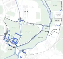 The city built fortifications in preparation for siege through Magdalen's grounds, including Dover's Speare (or Pier), a bastion that would have allowed observation to the north and east of the city. The earthworks where it was located, in the Water Meadow where the Cherwell forks, are still apparent today.[16] Further fortifications and earthworks were built to protect the Holywell Ford site to the north.[17] During the first Siege of Oxford, Charles I surveyed the battle from Magdalen Tower.[18]