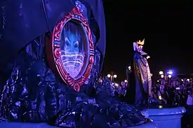Lohr Castle, which was once owned by Philipp Christoph, featured a large mirror which has been connected to the Evil Queen's iconic mirror and which can still be viewed there today. It was a product of the Lohr Mirror Manufacture (Kurmainzische Spiegelmanufaktur) and may have been in the castle as early as 1719, when Philipp Christoph took office.[5] The mirror "talked" via inscribed aphorisms. The upper right corner is labeled "Amour Propre" or "self-love," and the left corner reads "Pour la recompense et pour la peine" ("for reward and for punishment"). Mirrors from Lohr were so elaborately worked that they were accorded the reputation of "always speaking the truth". They became a favorite gift at European crown and aristocratic courts.[6]