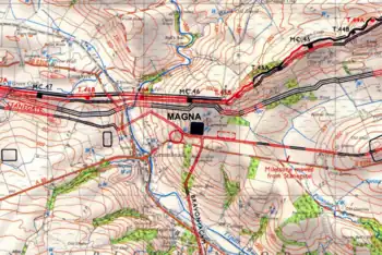 Magnis was originally built to guard the junction of the Maiden Way Roman road (running north to south) with the Stanegate Roman road (running west to east), the key supply route linking Coria (Corbridge) in the east to Luguvalium (Carlisle) in the west. As such the fort predates Hadrian's Wall. Its ruins are located at Carvoran in the civil parish of Greenhead in the English county of Northumberland. Magna is one of 16 Roman forts along Hadrian's Wall; there were also 80 smaller milecastle forts and 158 turrets along its length. The Maiden Way ran south from Magnis to Bravoniacum (Kirkby Thore near Penrith). An intermediate fort halfway between the two on the Maiden Way was Whitley Castle or Epiacum, just north of Alston in Cumbria, though the fort itself is just over the county boundary in Northumberland.