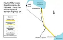 In addition to these two highways that followed most of its course, Highways 7 and 26 jogged along it for short distances through Brampton and Collingwood, respectively, before being rerouted.