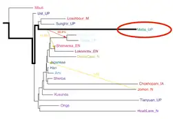 - ↑ Raghavan, Maanasa; Skoglund, Pontus; Graf, Kelly E.; Metspalu, Mait; Albrechtsen, Anders; Moltke, Ida; Rasmussen, Simon; Stafford Jr, Thomas W.; Orlando, Ludovic; Metspalu, Ene; Karmin, Monika; Tambets, Kristiina; Rootsi, Siiri; Mägi, Reedik; Campos, Paula F.; Balanovska, Elena; Balanovsky, Oleg; Khusnutdinova, Elza; Litvinov, Sergey; Osipova, Ludmila P.; Fedorova, Sardana A.; Voevoda, Mikhail I.; DeGiorgio, Michael; Sicheritz-Ponten, Thomas; Brunak, Søren; Demeshchenko, Svetlana; Kivisild, Toomas; Villems, Richard; Nielsen, Rasmus; Jakobsson, Mattias; Willerslev, Eske (January 2014). "Upper Palaeolithic Siberian genome reveals dual ancestry of Native Americans". Nature. 505 (7481): 87–91. Bibcode:2014Natur.505...87R. doi:10.1038/nature12736. PMC 4105016. PMID 24256729.