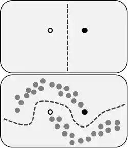 Manifold regularization can classify data when labeled data (black and white circles) are sparse, by taking advantage of unlabeled data (gray circles). Without many labeled data points, supervised learning algorithms can only learn very simple decision boundaries (top panel). Manifold learning can draw a decision boundary between the natural classes of the unlabeled data, under the assumption that close-together points probably belong to the same class, and so the decision boundary should avoid areas with many unlabeled points. This is one version of semi-supervised learning.