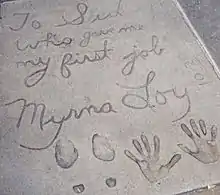 Many older entries contain personal messages to Sid Grauman, such as Myrna Loy's 1936 contribution. Loy's first job was as a dancer at the theater in the 1920s.