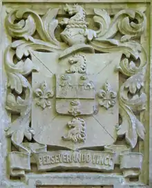 Walter Septimus Curtis (born 1871) was the owner of the estate in the early 1900s. He was lord of the manors of Denbury and of adjoining Newton Abbot and Newton Bushel.[28] He was a barrister of Lincoln's Inn and was educated at Trinity Hall, Cambridge.[29] He was the 3rd and youngest son of John Curtis (1836-1878) by his wife Juliana Davies, eldest daughter of John Davies of Manchester. Walter's grandfather was Matthew Curtis (1807–1887) of Thornfield in the parish of Heaton Mersey, Lancashire, the leading manufacturer of cotton-spinning machinery in Britain and thrice Mayor of Manchester.[30] Walter married Eleanor Francis Master, daughter and heiress of Robert Edward Master, JP, Madras Civil Service, of Hillingdon Furze, Uxbridge, Middlesex,[31] by whom he had one son, Robert Master Curtis (born 1920) and 6 daughters,[28] including Lettice Curtis (1915-2014) an aviator, flight test engineer, air racing pilot, and sportswoman.[32] Walter Curtis made substantial additions including the gatehouse[1] and the very high (5 metre) and very long boundary wall in which it is set, probably built between 1912 and 1914,[33] which stretches from the village of Denbury for several hundred yards along the roadside, past Denbury Green. His coat of arms (Per saltire argent and azure two horse's heads erased in pale gules and in fess as many fleurs-de-lys of the first[28] with inescutcheon of pretence for Master Azure, a fess embattled between three griffin's heads erased or[34]) is sculpted on a stone tablet above the inner entrance of the gatehouse.