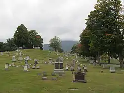 The Maple Street Cemetery occupies 16 acres (6.5 ha) of land north of Adams' central business district, stretched along the north side of Maple Street between Forest Park Avenue and Notch Road. The setting is on a rise above the plain of the Hoosic River, with nearby Mount Greylock as a backdrop to the west.[2]