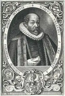 Mark was familiar with the Italian language and interested in historical research, and in the study of Greek and Latin authors, whose dissemination he promoted by financing the publishing house "Ad Insignia Pinus".[2] The most important of his many works is his Rerum Boicarum libri quinque, dealing with the early history of the Bavarians, which was translated into German by the author's brother Paul (died 1620). His collected works, under the title Marci Velseri opera historica et philologica, were collected and published in 1682 with a biography of Mark by C. Arnold.[5]