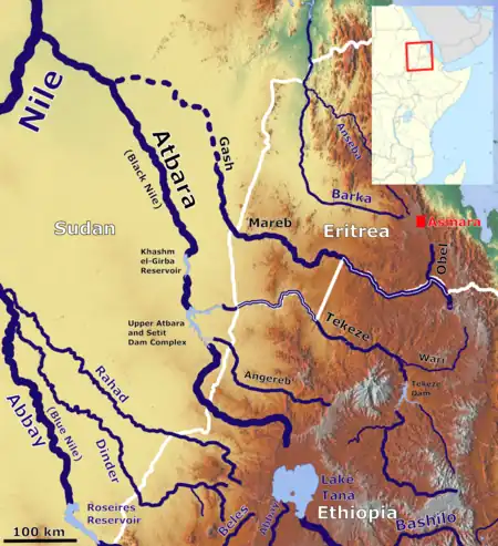 According to the Statistical Abstract of Ethiopia for 1967/68, the Mereb River is 440 kilometres (270 mi) long. The Ethiopian Ministry of Water Resources reports its Ethiopian catchment area as 5,700 square kilometres (2,200 sq mi), with an annual runoff of 0.26 billion cubic meters.[2] Other sources talking about a catchment of 21,000 square kilometres (8,100 sq mi) to 44,000 square kilometres (17,000 sq mi) over all, and a discharge of 21.6 cubic metres per second (760 cu ft/s) in average over the year, and 870 cubic metres per second (31,000 cu ft/s) in peaks.[3] Its headwaters rise south-west of Asmara in central Eritrea. It flows south, bordering Ethiopia, then west through western Eritrea to reach the Sudanese plains near Kassala. Unlike the Setit or Takazze rivers, which flow out of Ethiopia and also forms a natural border with Eritrea, the waters of the Mareb do usually not reach the Nile[4] but dissipate in the sands of the eastern Sudanese plains.