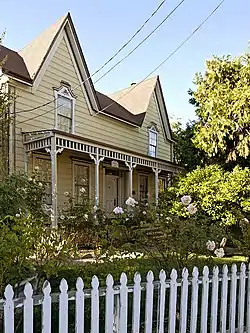 It has twin gables facing to the front, from a steeply pitched roof, which was originally shingled with redwood shingles. Two upper front windows have Eastlake window hoods and much of the original glass remains in its windows. The house's floors and ceilings are made of redwood tongue-and-groove boards.[2]