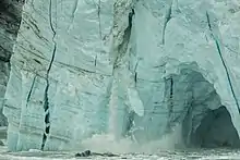 Margerie Glacier is categorized as a tidewater glacier, one of eleven remaining in the park, with eight in the bay and three on the Pacific Ocean coastal area of the park.[11] A tidewater glacier is one whose terminus encounters seawater at least at high tide, if not at all tide levels. Margerie Glacier and six other glaciers have termini that are fully submerged at all tide levels.[13] Margerie Glacier has a total height of 350 feet (110 m) of which 250 feet (76 m) rises above the water level and 100 feet (30 m) is beneath the water surface.[2] Like many glaciers it contains moraines which appear as dark areas composed of dirt, stones and larger rocks mixed in with the ice and transported downstream to eventually be ejected from the glacier's terminus. The glacial ice appears blue as a result of the absorption of red, orange, yellow and green wavelengths of light and, consequently, pools of meltwater on top of the glacier will appear bright blue. Margerie Glacier is a much cleaner glacier with less debris compared to the Grand Pacific Glacier located adjacent to Margerie's northeastern flank. It is also one of the most active glaciers for ice calving along with the Johns Hopkins Glacier.[4] As a glacier calves it makes sounds similar to gunshots from the cracking of the ice and the release of trapped air, then a roaring boom as the ice tumbles down into the sea.[14] Freshwater upwellings emerge from the central area of the glacier's terminus, generated by meltwater streams running underneath the glacier. Such areas attract sea birds which feed on the fish that can be found there.[4]