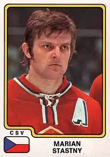 Marián Šťastný (born January 8, 1953) is a Slovak former professional ice hockey right winger who played for five seasons in the National Hockey League from 1981 through 1986 for the Quebec Nordiques and Toronto Maple Leafs. Prior to moving to the NHL Šťastný had played in Czechoslovakia for Slovan ChZJD Bratislava with his brothers, Peter and Anton. They defected in 1980, joining the Nordiques, though Marián waited until 1981 to join them.
