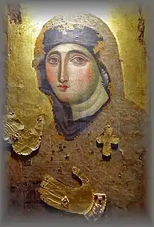 The wood on the painting ground is badly eaten away, but the portrait as a whole, especially the face, the gold nimbus and one hand, are still clearly visible.[2] In later times, Mary's interceding hands were covered with gold sheets to protect them from kisses, and a gold cross was added to the shoulder.[3]