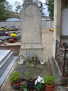 She spent most of her time in Louveciennes, typically eight months of the year. She formed new friendships with people including the writer and man of letters M. de Briffaut, the playwright M. Despré, the writer M. Louis Aimé-Martin, the composer M. Désaugiers, the painter and antiquarian Comte de Forbin, and the famous painter Antoine-Jean Gros. She hosted these people and socialized with them regularly in her countryside home or in Paris, as well as her old friend the Princess Kourakin. She painted Saint Geneviève, with the face being a posthumous portrait of 12-year old Julie. For the local chapel, the Comtesse de Genlis graced this painting with two separate poems; one for the saint, the other for the painter. She spent her time with her nieces Caroline Rivière and Eugénie Tripier-Le Franc, whom she came to regard as her own children. She had tutored the latter in painting since childhood and was greatly pleased to see her blossom into a professional artist. Eugénie and Caroline would assist her in writing her memoirs, late in her life. She died in Paris on 30 March 1842, aged 86. She was buried at the Cimetière de Louveciennes near her old home. Her tombstone epitaph says "Ici, enfin, je repose..." (Here, at last, I rest...).[28]